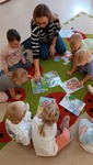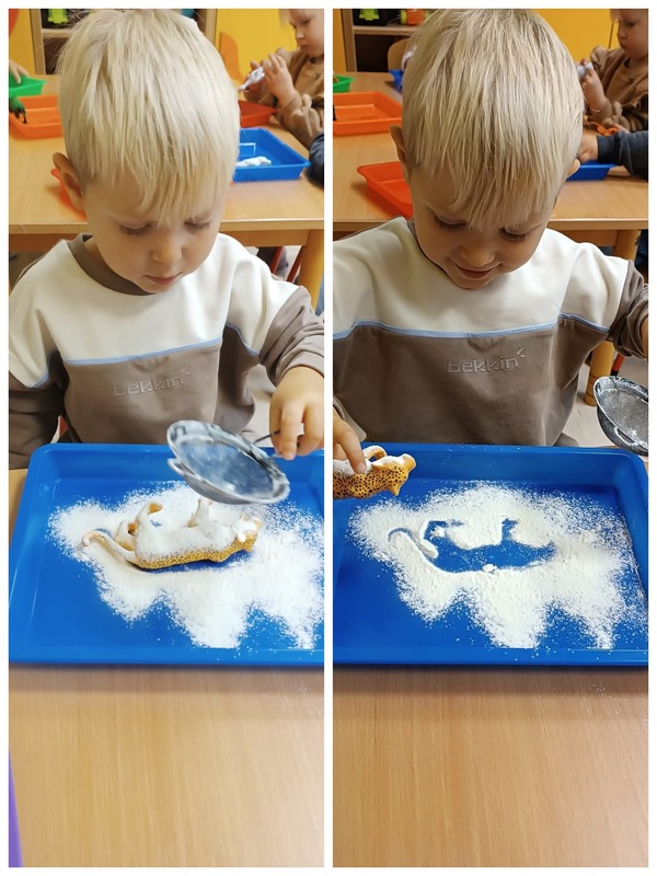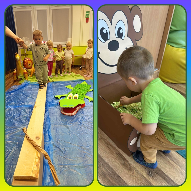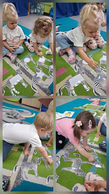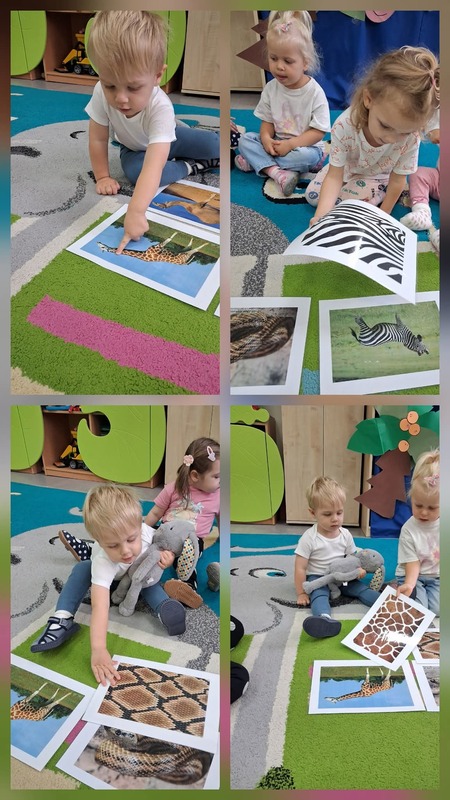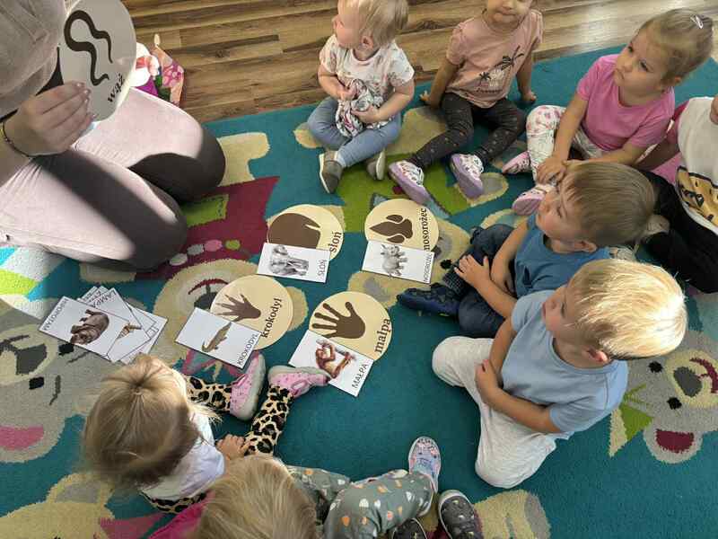 Nie zabrakło również zajęć ruchowych, podczas których dzieci naśladowały sposób poruszania się zwierząt – skakały jak małpki, maszerowały jak słonie i pełzały jak węże. Wspólnie bawiliśmy się w zagadki i zgadywanki, rozpoznając odgłosy i nazwy zwierząt.